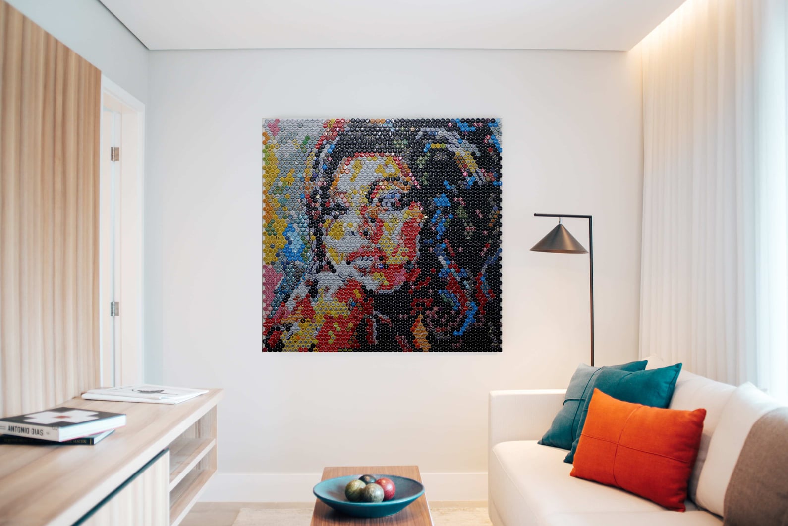 Das Bild in der Größe 140cm x 140cm mit 2613 gebrauchten Kronkorken, die mit einer speziellen Technik auf die doppelt beschichtete und silbern gerahmte Holzplatte (8mm) angebracht wurden, stellt die britische Soul- und Jazz Sängerin Amy Winehouse dar, die am 23.07.2011 im Alter von 28 Jahren in Camden, London verstarb.