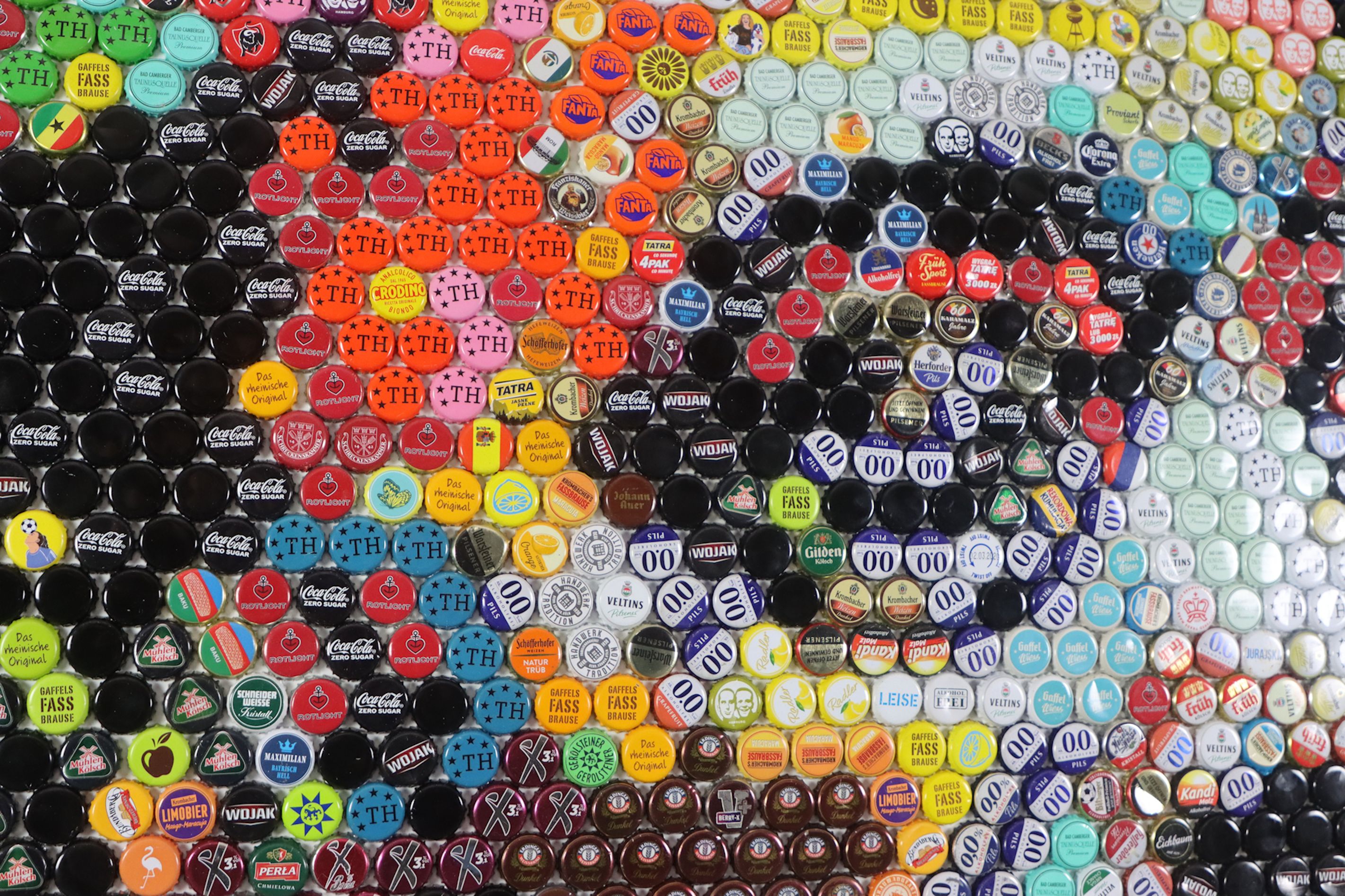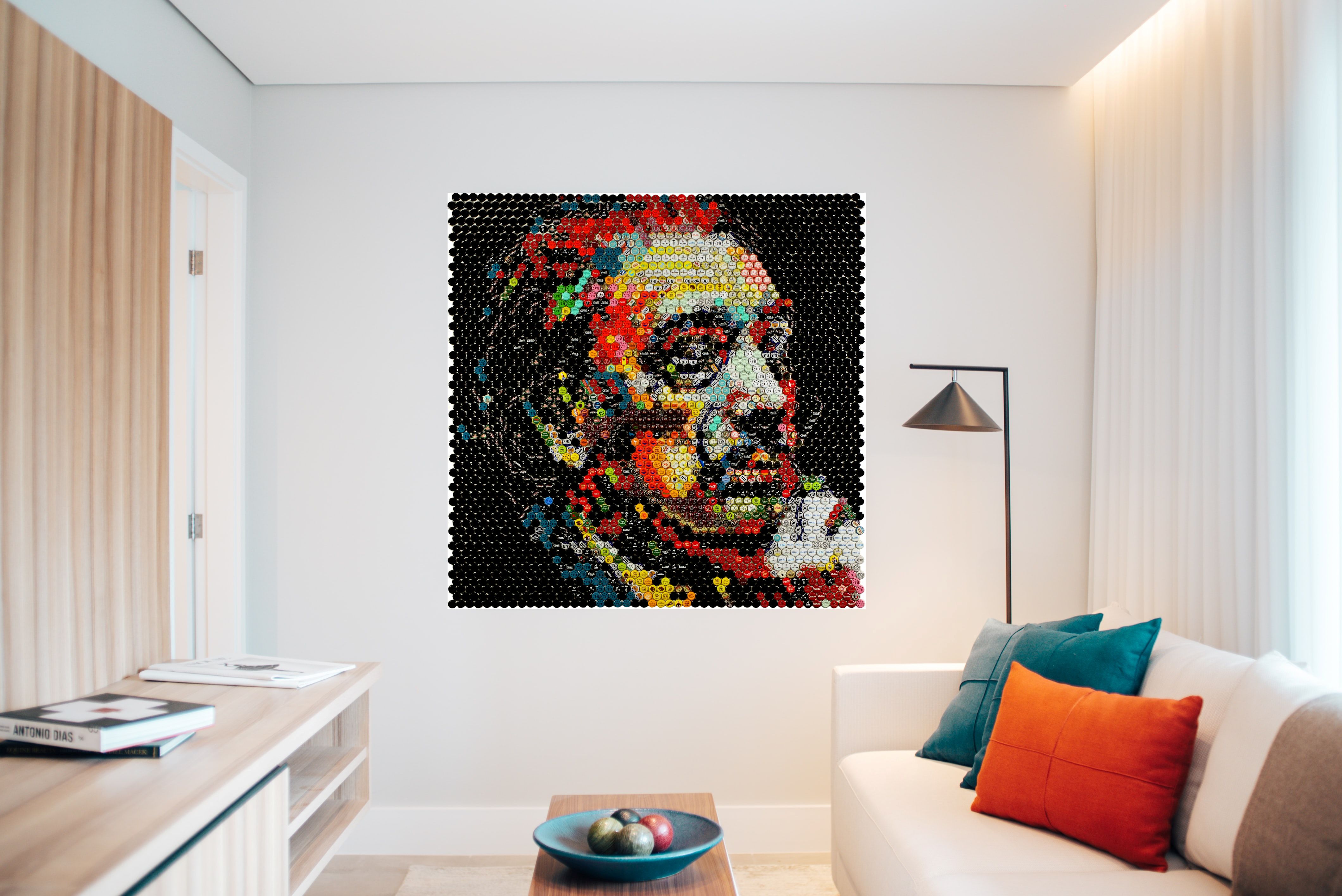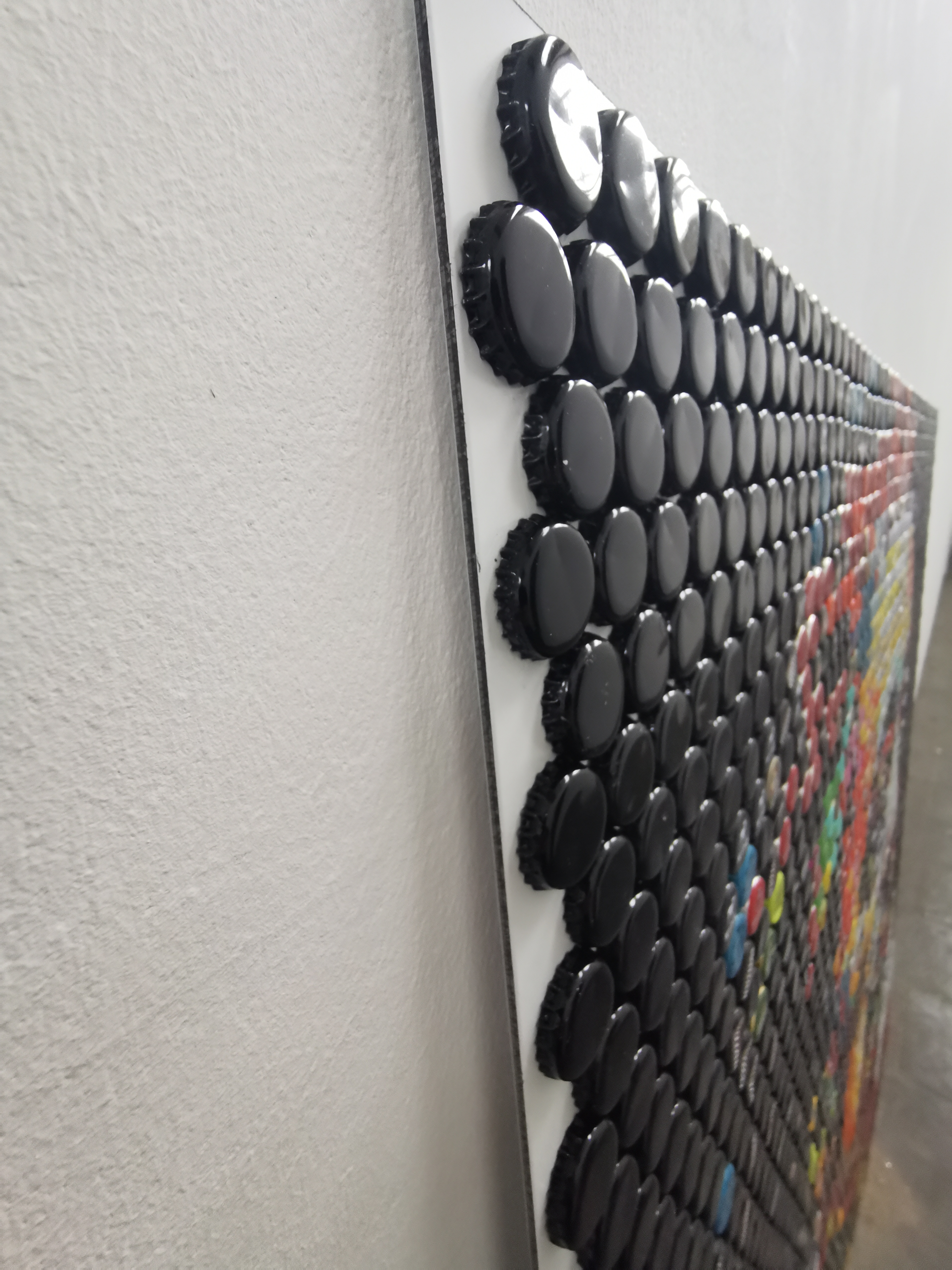 Dieses Bild stellt eine eindrucksvolle Hommage an Salvador Dalí dar, indem es seine surrealistischen Visionen durch die innovative Verwendung von Kronkorken neu interpretiert. Die Künstlerische Auseinandersetzung mit dem Portrait des berühmten Künstlers entfaltet sich in einem vielschichtigen Farbspiel, das die Grenzen zwischen Pop Art und abstrakter Gestaltung verwischt. Das Mosaik verkörpert nicht nur das Porträt Dalís, sondern auch einen Akt der Wiederverwendung, der beispielhaft für nachhaltige Kunstpraxis steht. Die meisterhafte Anordnung der Kronkorken auf dem Hintergrund macht dieses Werk zu einem leuchtenden Beleg für das Potenzial recycelter Materialien in der Kunst.