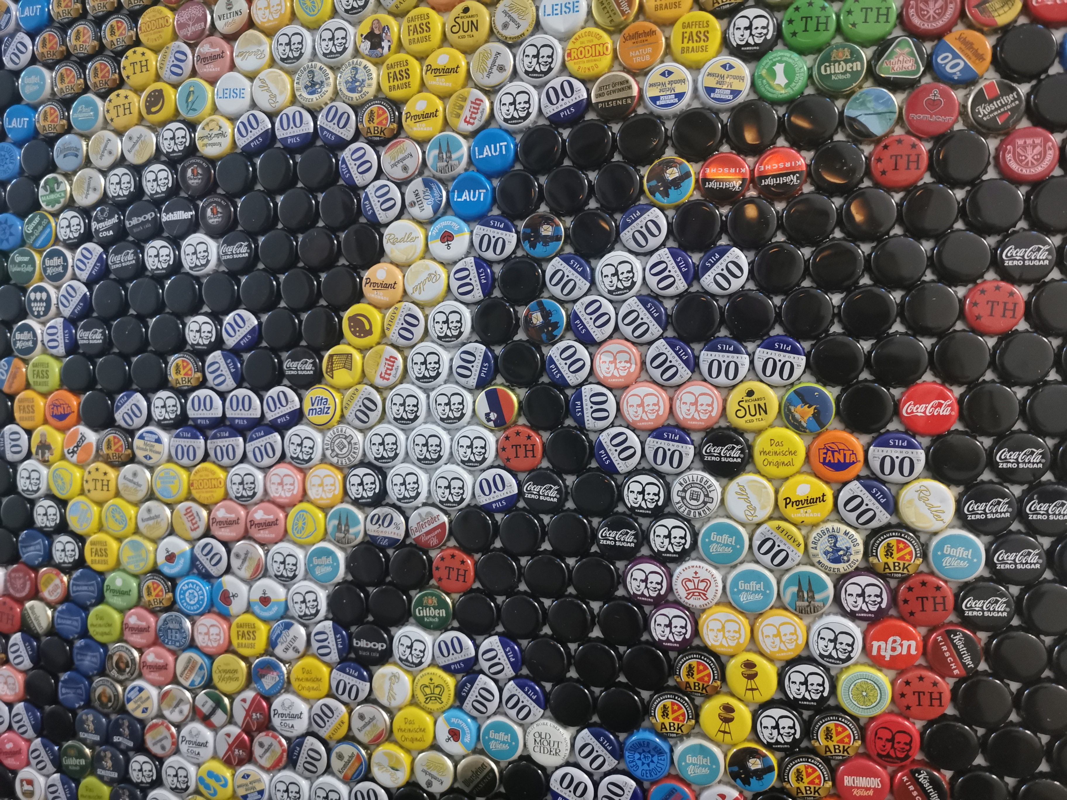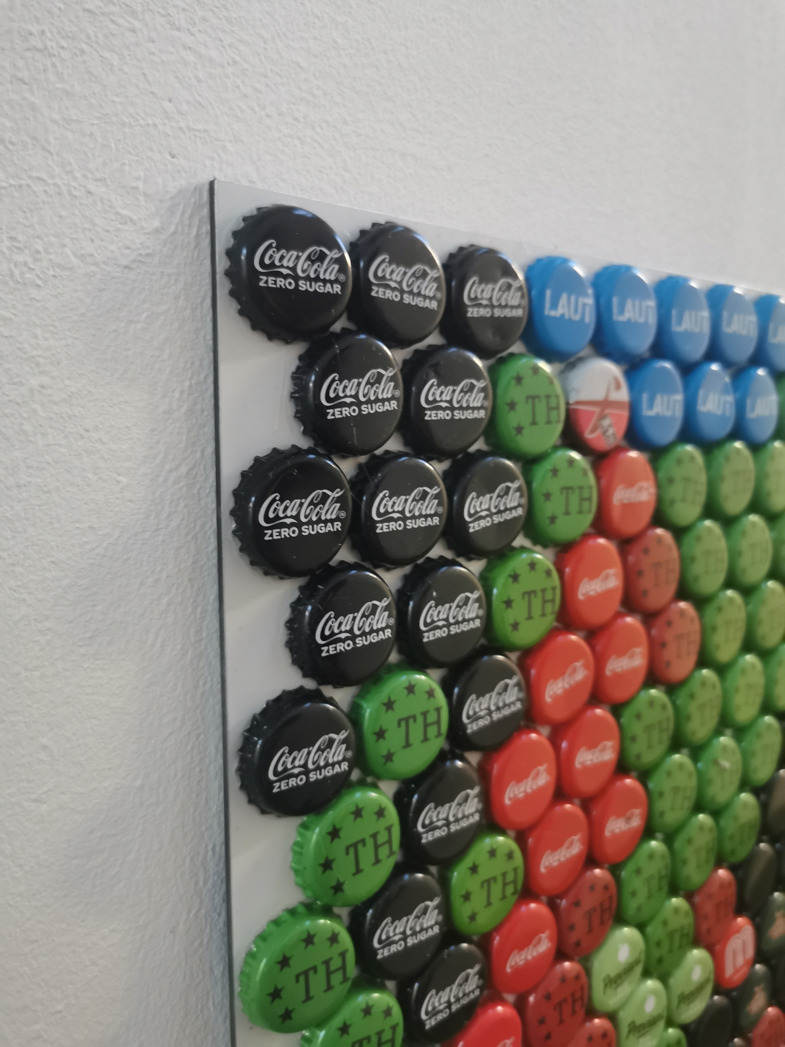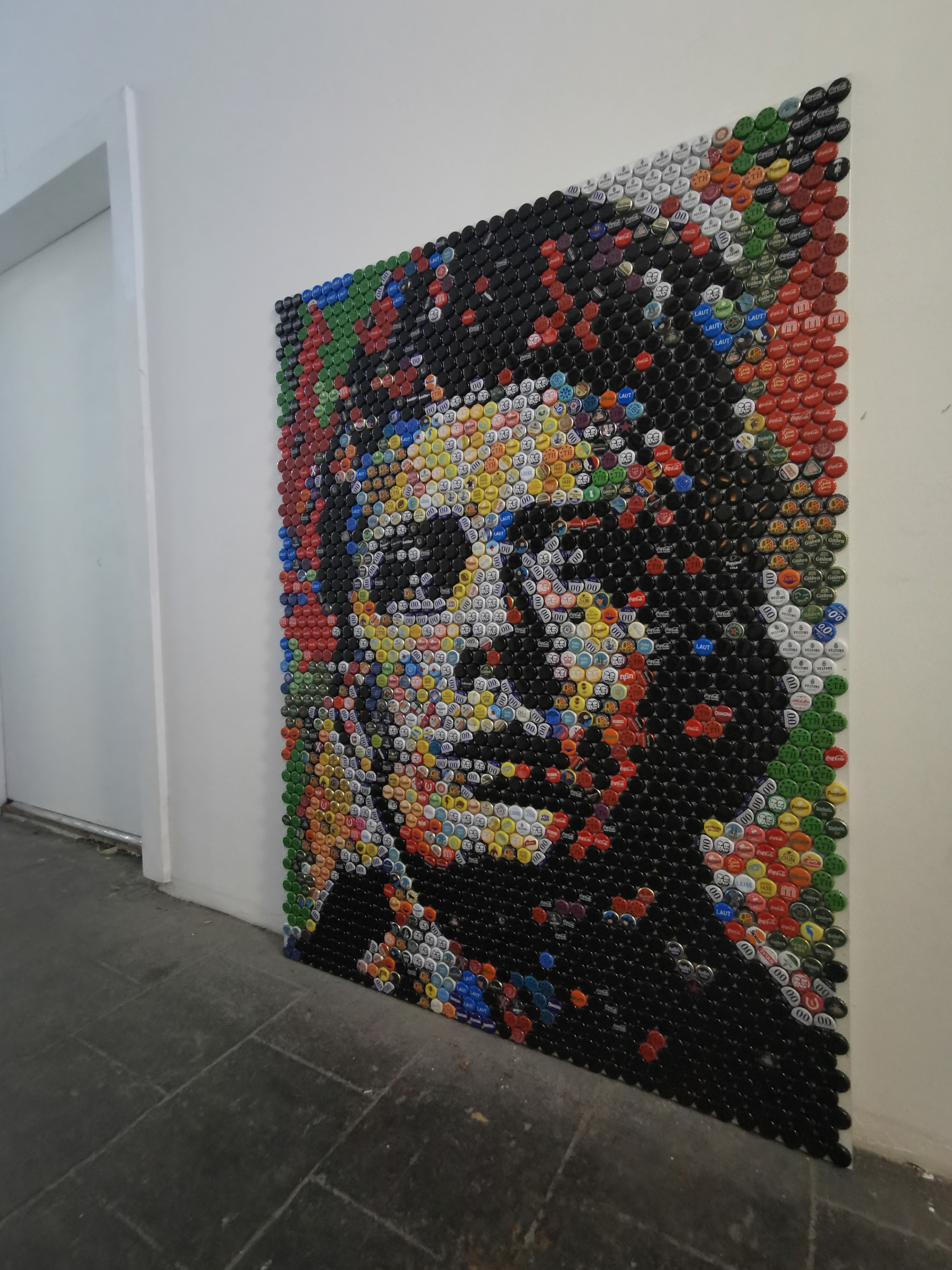 Das Bild in der Größe 148cm x 110cm mit 1952 gebrauchten Kronkorken, die mit einer speziellen Technik auf die beidseitig weiß beschichtete Alu Dibond Platte (3mm) angebracht wurden, stellt den US-amerikanischen Theater- und Filmschauspieler James Dean dar. James Dean starb im Alter von 24 jahren und wurde durch den Film "...denn sie wissen nicht, was sie tun" zum Jugendidol einer ganzen Generation.