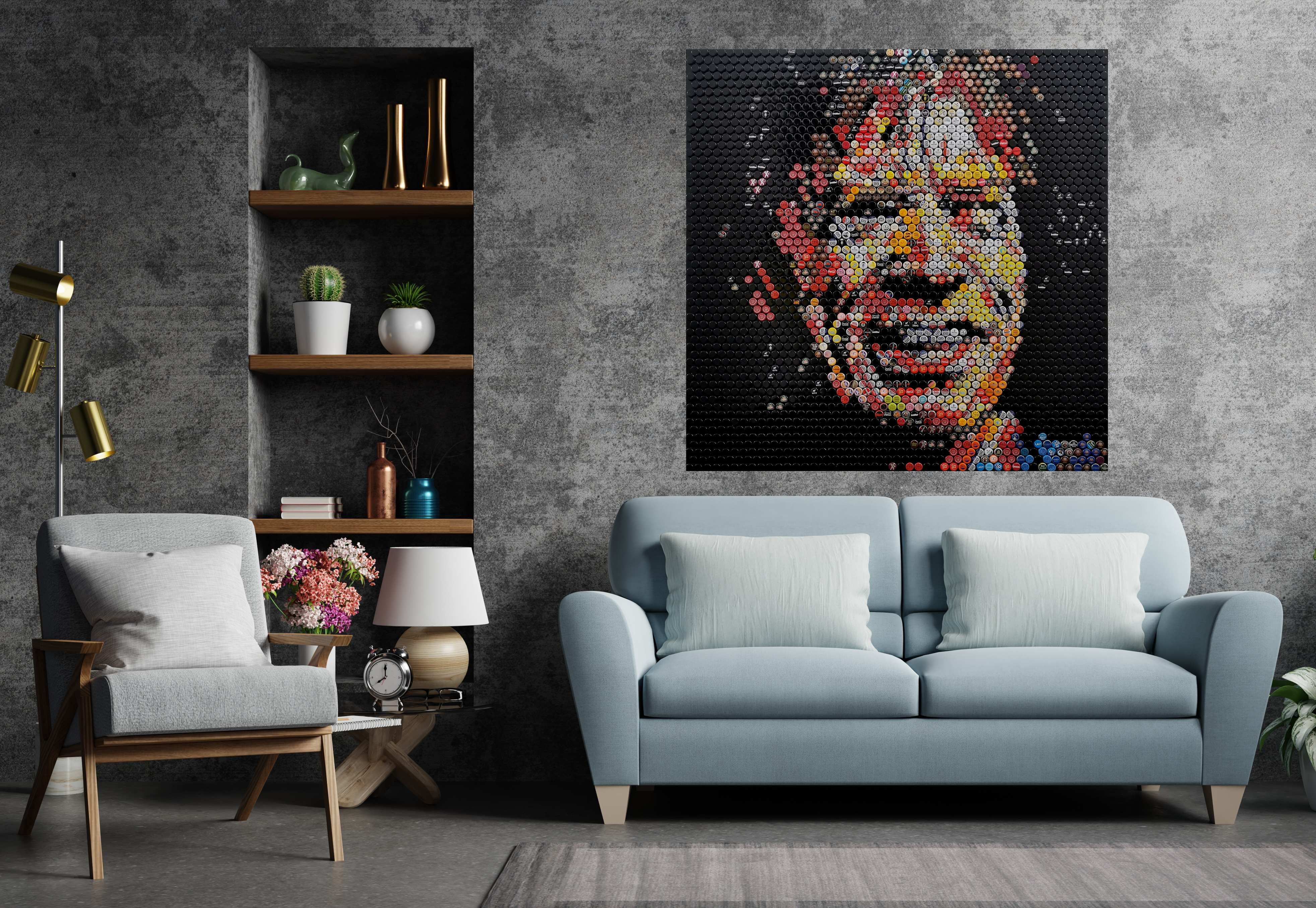 In diesem faszinierenden Porträt fängt Henning Leuschner die unverwechselbare Aura Mick Jaggers, der Ikone der Rockmusik, mit einer neuartigen Technik und alltäglichen Materialien ein. Die Komposition aus bunten Kronkorken erweckt Jaggers lebendige Persönlichkeit auf eine explosive Weise zum Leben. Dieses kühne und dynamische Stück fängt nicht nur die Essenz Jaggers als Musiker und Frontmann der Rolling Stones ein, sondern verkörpert auch die kreative und rebellische Geisteshaltung, die er symbolisiert. Eine außergewöhnliche Hommage an den Geist des Rock'n'Roll, die jeden Betrachter dazu einlädt, die tieferen Schichten der Porträtkunst und der damit verbundenen kulturellen Ikonografie zu erforschen.