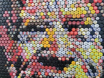 Das Bild in der Größe 140cm x 140cm mit 2613 gebrauchten Kronkorken, die mit einer speziellen Technik auf die beidseitig tiefschwarze beschichtete Alu Dibond Platte (3mm) angebracht wurden, stellt Sir Michael Philip Jagger (* 26. Juli 1943 in Dartford, Grafschaft Kent, England) dar. Jagger ist ein britischer Musiker, Sänger und Songwriter. Berühmt wurde er als Frontmann der britischen Rockgruppe The Rolling Stones. Jagger spielt Mundharmonika, Gitarre und Klavier. Er wirkte auch als Schauspieler, Produzent und Komponist bei mehreren Filmen mit. Als Künstler verwendet er den Namen Mick Jagger.