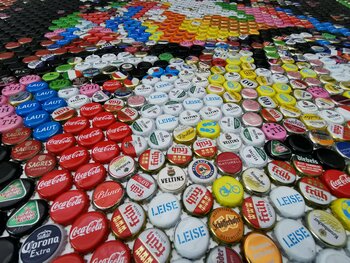 Das Bild in der Größe 140cm x 140cm mit 2613 gebrauchten Kronkorken, die mit einer speziellen Technik auf die beidseitig weiß beschichtete Alu Dibond Platte (3mm) angebracht wurden, stellt die mexikanische Malerin/Künstlerin Frida Kahlo de Rivera (* 6. Juli 1907 in Coyoacán, Mexiko-Stadt, als Magdalena Carmen Frieda Kahlo y Calderón; † 13. Juli 1954 ebenda) dar. Sie zählt zu den bedeutendsten Vertretern einer volkstümlichen Entfaltung des Surrealismus, wobei ihr Werk bisweilen Elemente der Neuen Sachlichkeit zeigt.