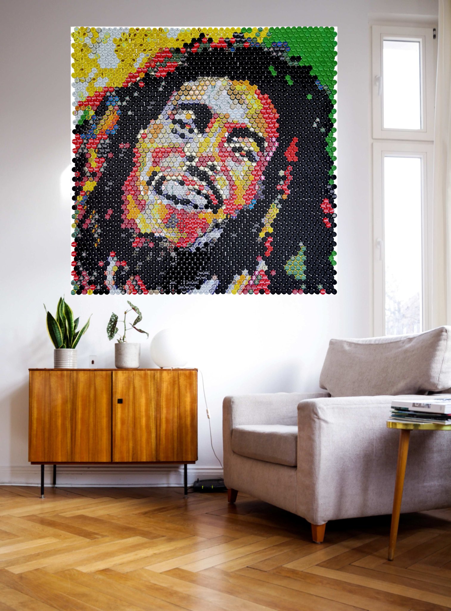 Dieses einzigartige Bild in der Größe 140cm x 140cm mit 2613 gebrauchten Kronkorken, die mit einer speziellen Technik auf die doppelt beschichtete und silberngerahmte Holzplatte (8mm) angebracht wurden, stellt den jamaikanischer Reggae-Sänger, Gitarrist, Songwriter Bob Marley dar. Marley gilt als bedeutendster Vertreter und Mitbegründer der Reggae-Musik, die durch ihn und seine Band The Wailers ab Mitte der 1970er Jahre international bekannt wurde.