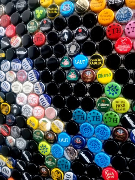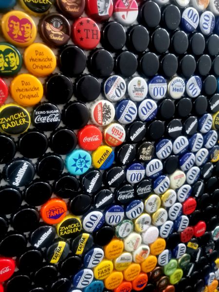 Die Verwendung von Kronkorken als gestalterisches Mittel verbindet künstlerische Aussage und ökologische Dimension: Alltägliche Wegwerfobjekte werden zu Trägern von Farbe und Form, wodurch ein Spannungsfeld zwischen Konsum, Wiederverwertung und künstlerischer Wertschöpfung entsteht.